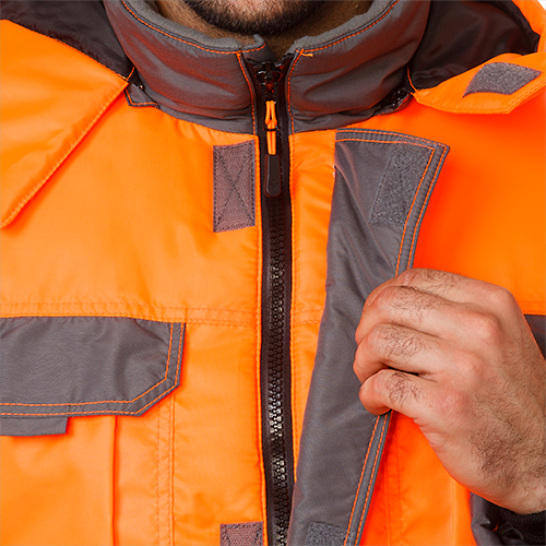 Jacket featuring a strong double-slider zipper secured on Velcro storm flap, inside fleece liner in the upper part of the storm flap, breast and side pockets, button cuffed sleeves to prevent fabric getting into machinery. Funnel neck collar is insulated with high-quality fleece (manufactured in Spain) Drawcord hem for additional wind protection. Detachable zippered hood. Outside sleeve seams and inside wool blend rib-knit storm cuffs for additional protection. A loop for a badge under pocket flap on the left breast side.