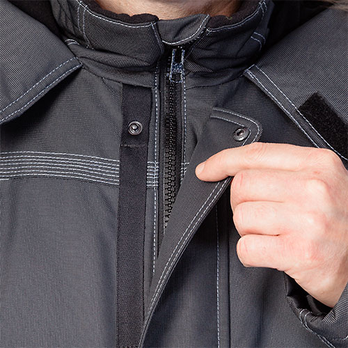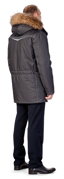 Dual-purpose heat-insulation elongated jacket: Jacket features 3 layers of insulation + zip-out detachable fleece vest. Double-slider zipper and external storm flap with snap-buttons. Inside fleece lined in the upper part storm flap. Six slash zippered pockets with bagging made of warm and soft knitted fabric and a slash zippered pocket on the left sleeve; zippered A4 size pocket for documents in the forepart, 7 lined pockets. Special design of sleeves allows arms to bend easily. The sleeves are equipped with inside wool blend knitted storm cuffs. Drawstrings for width adjustment: Elasticised back waistband, elastic cord and toggle locks along the waistline of the liner, bottom hem and along the face opening of the hood. Funnel neck collar with high-rise back is lined with soft fleece insulation providing a good protection from cold. Detachable, volume adjustable heat-insulated hood with natural fur trim (racoon). The hood flaps are fastened on snap buttons. Reflective trimming such as printing on front and back yoke, on sleeves ensure good visibility of the wearer.