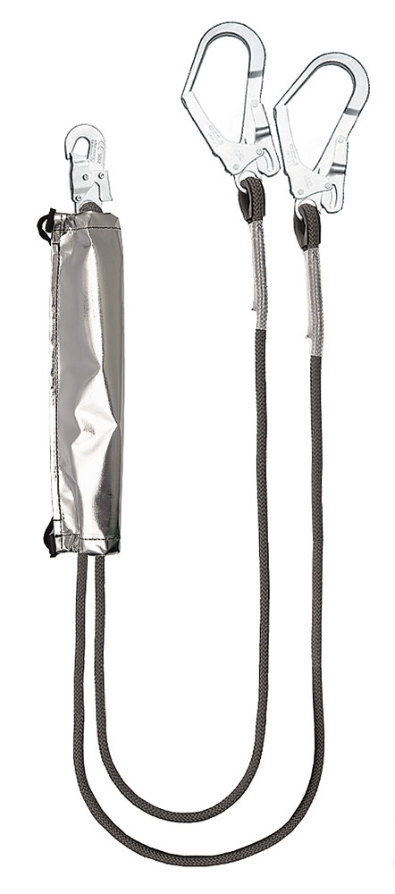 Distinguishing features: Two-leg fall restraint lanyard made of KEVLAR braided polyamide cord with a tear-web shock-absorber in a fire-resistant cover, 2 latch hooks with AZ022 self-locking latch (opening 50 mm) on lanyard working ends.
