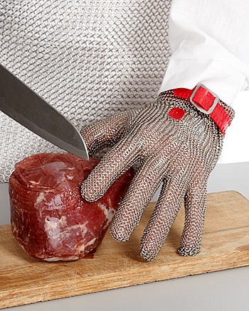 Stainless steel mesh glove with plastic strap. Outer diameter of the rings – 4 mm. Wire diameter – 0.5 mm. Glove is equipped with a tag to identify the user. Reversible model: easily turns inside out – can be worn on either the left or right hand. The service life significantly increased due to the strength of the stainless steel and tolerance to any hygienic processing. Recommended industries: food industry et al.