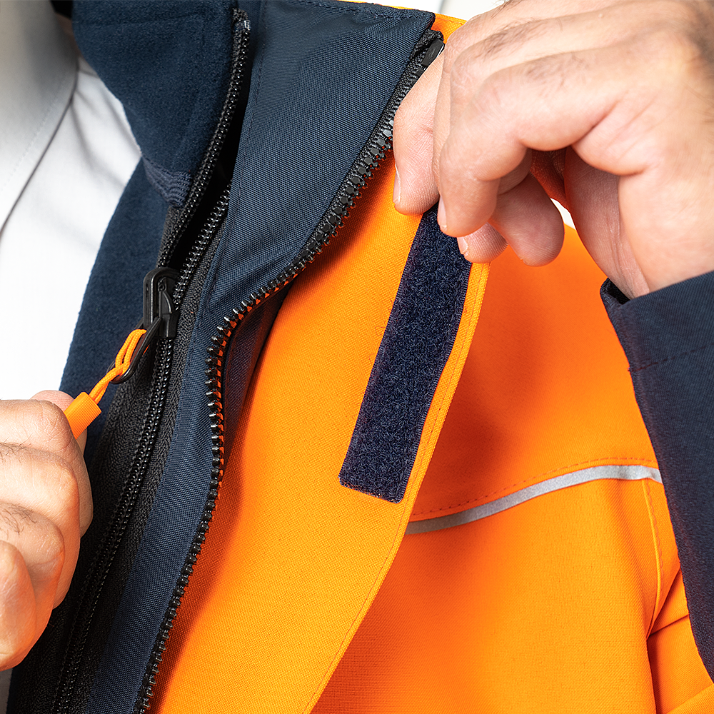 - Front closure with two wind-protection flaps and protective rim on the right prevent water from entering inside the garment;