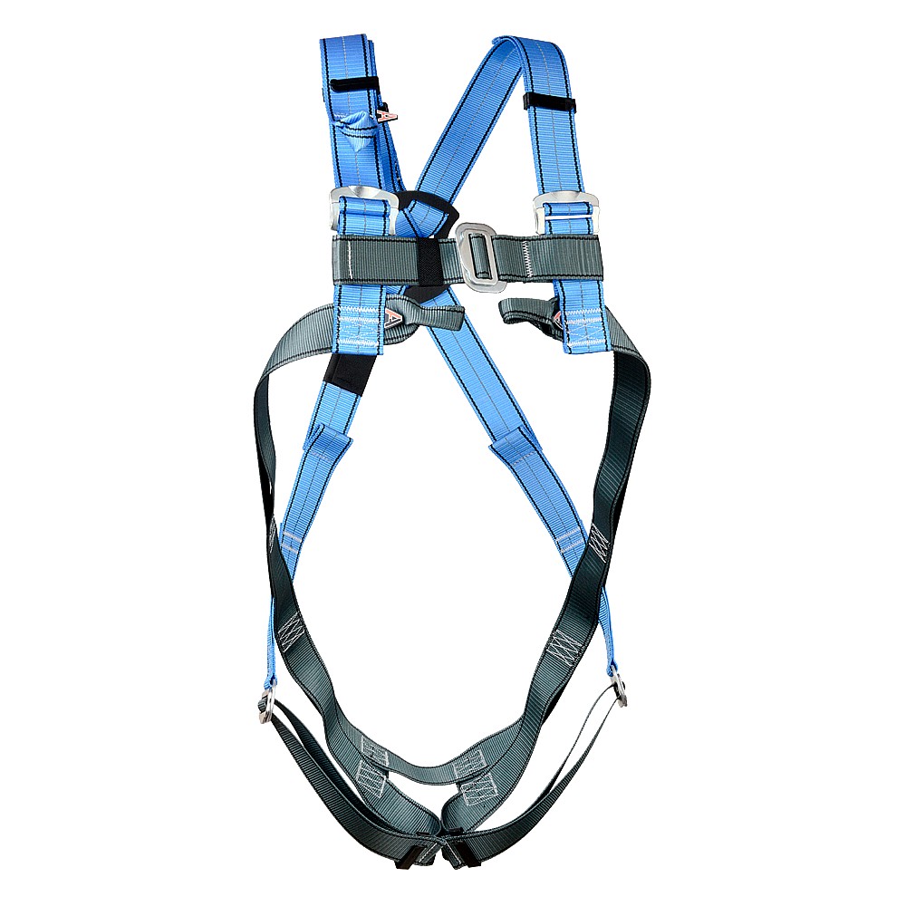 - To identify the top and bottom of the harness, the webbing has different colors (blue with a retroreflective tape, gray).