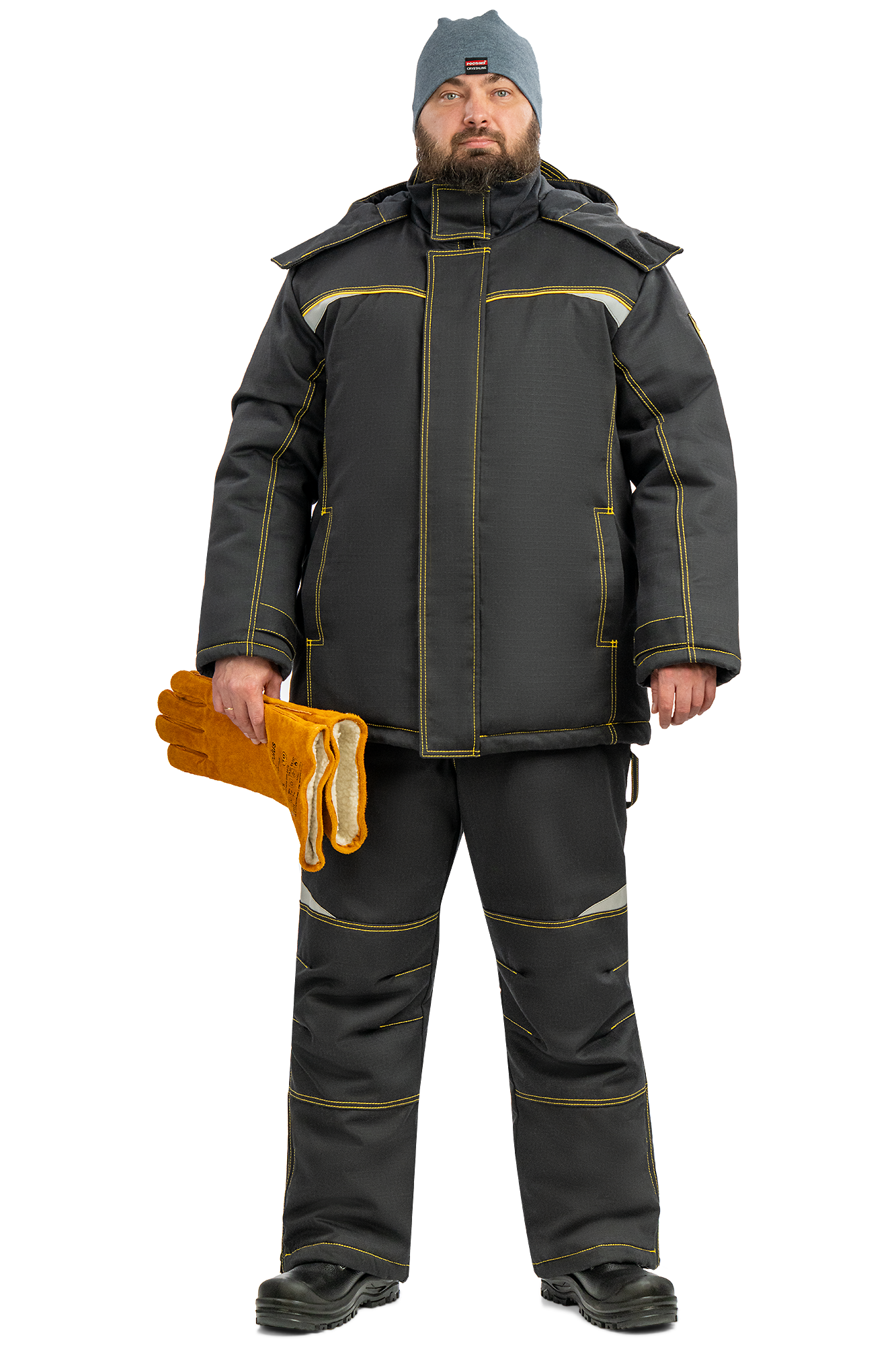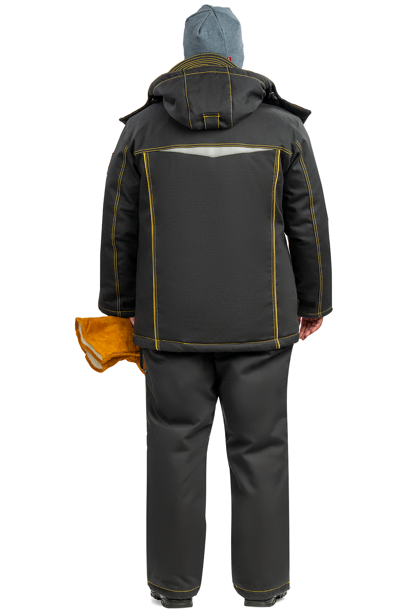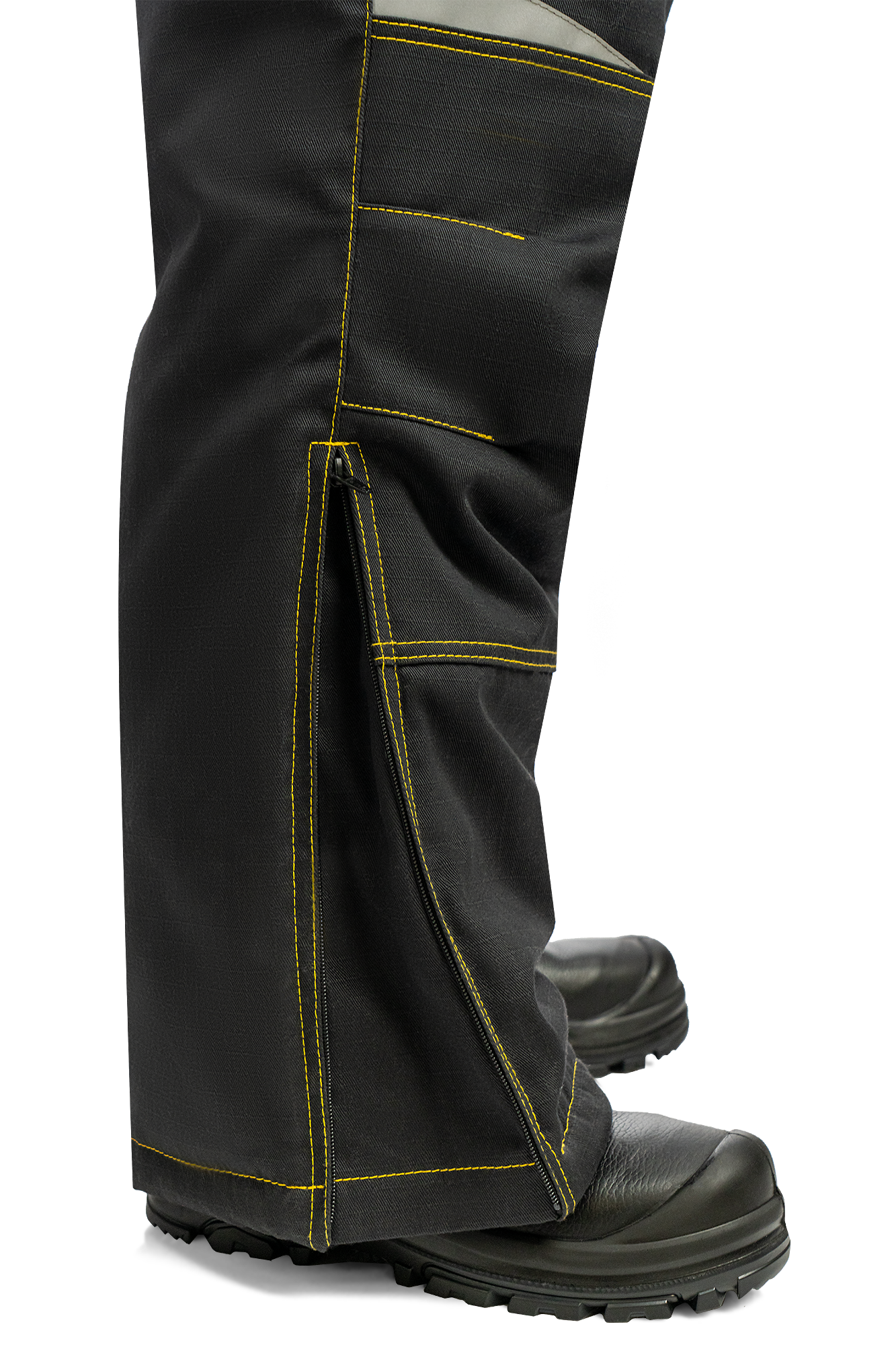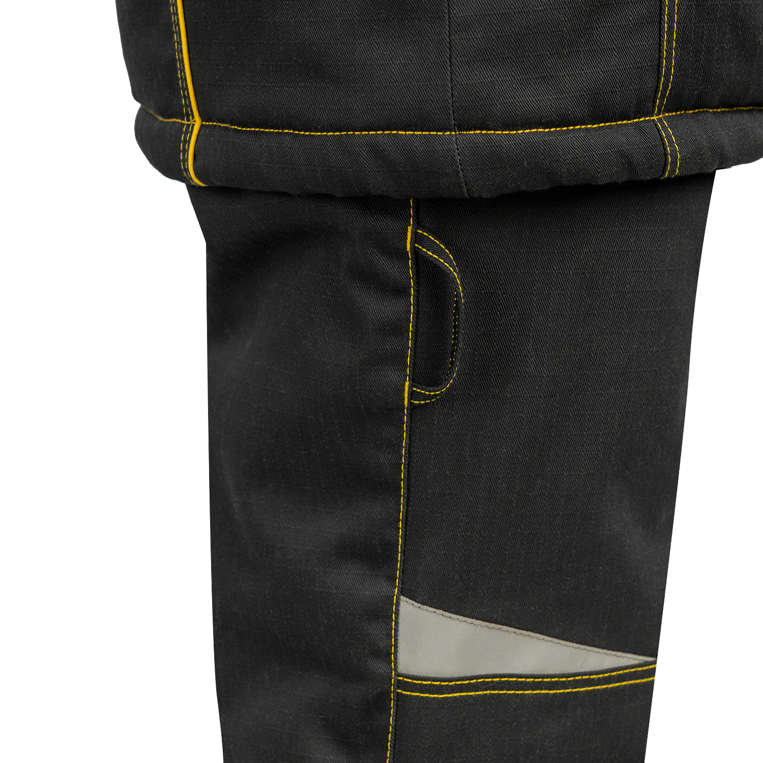 Black work suit with yellow piping, contrasting seams and triangular reflective inserts give the product a dynamic look. Yellow color warns of increased risk of the performed works.