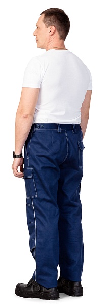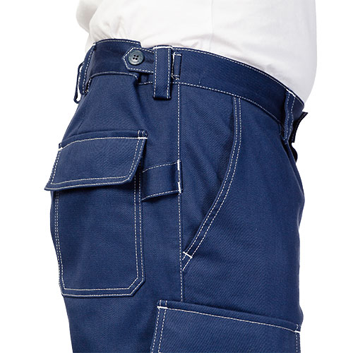 Trousers with central zipper secured on a button on the waistband. Waistband with belt loops and side-straps with buttons for volume adjustment. Multiple pockets, a loop holder for instruments on the side of the waistband. Darted kneepad pockets for shock-absorbing pads.
