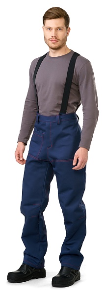 Button fasteners in side seams and a zipper in the middle seam is provided for convenience. Trousers with patch pocket on the right side, inside pockets in the knee area to accommodate knee pads for workers who have to spend extended time on their knees in a confined space. Trousers are completed with elastic bib straps for convenience.