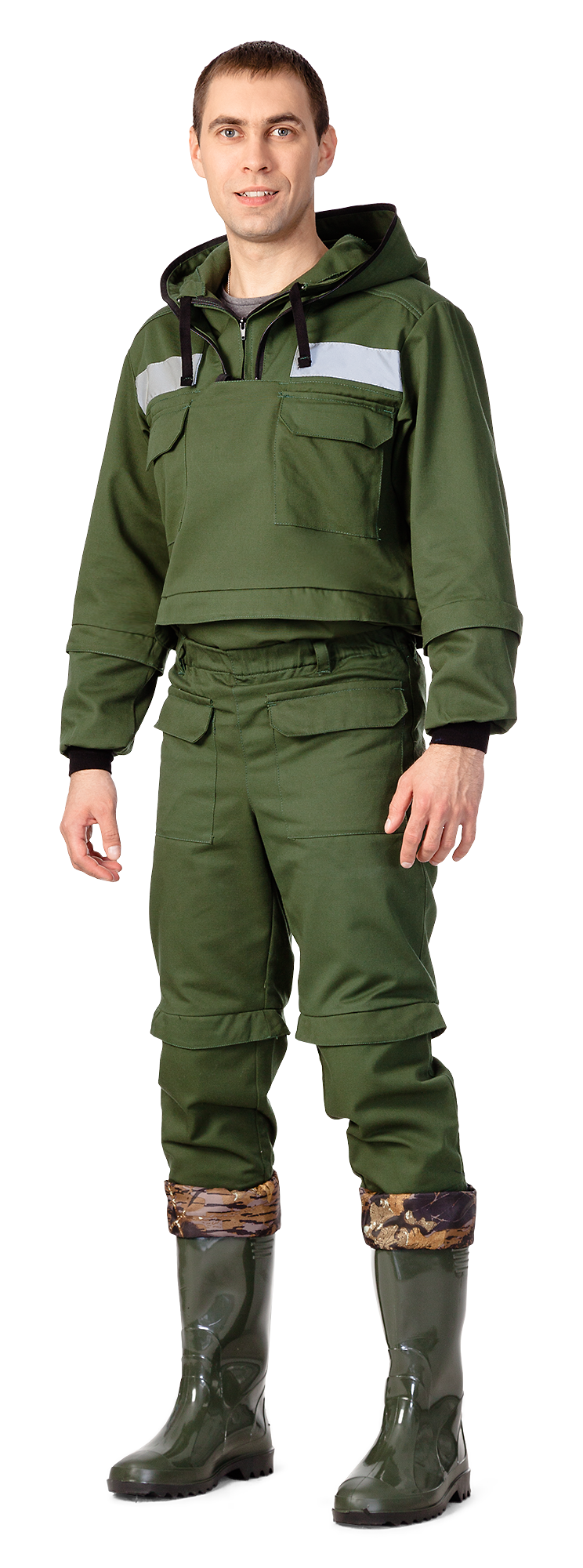 Trousers have elasticized waistband and belt-loops. Patch pockets with flaps preventing garbage and moisture penetration into the pockets. Velcro tape fastener. Separate bagging of the pocket, so it can be turned out to clear it from insects and garbage. Knee areas reinforced with patches for extra durability and to prevent chafing. Rib-knit cuffs (set-in gaiters) under the trouser bottom to prevent insects getting inside the garment. Flounce-shaped protective diverting folds above knee areas, as on the jacket.