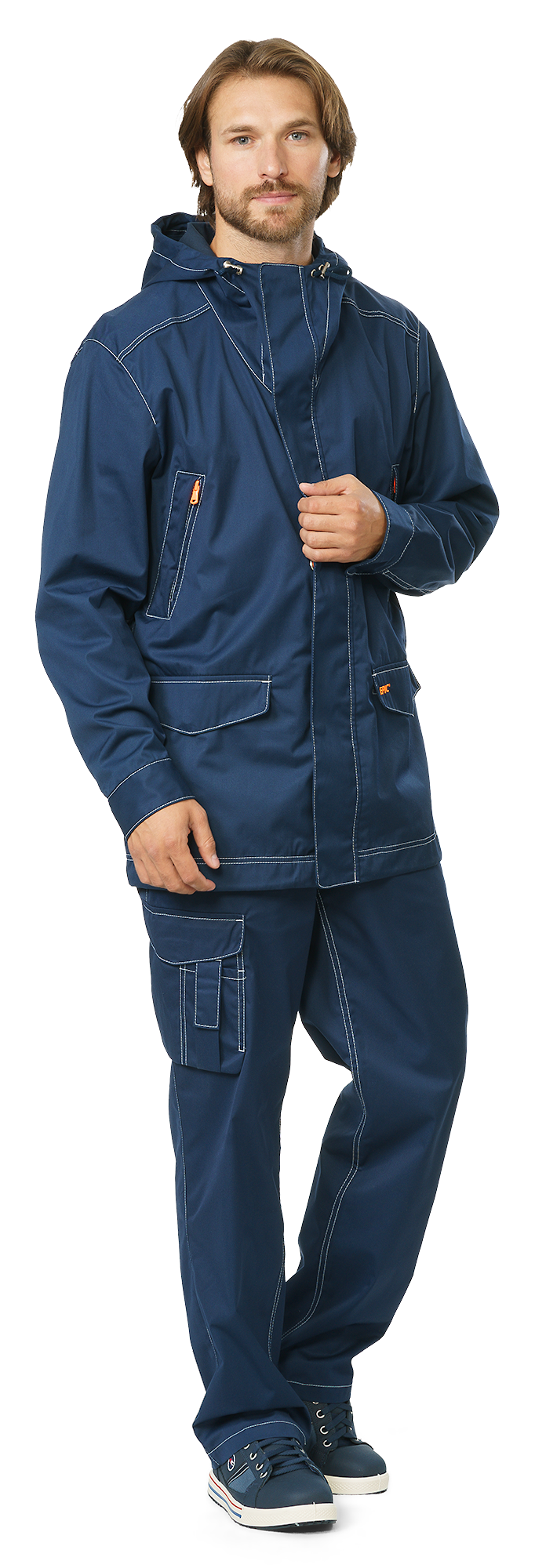 Elongated jacket with central fastener on double-slider zipper with inside flap and external storm flap secured on concealed snap-buttons. Non-detachable one-piece hood with band collar. Design of breast and side pockets prevents moisture penetration. Special sleeve design (allowing arms to bend easily), with barrel cuffs on concealed snap-buttons featuring a zippered triangle-shaped insert (pufta) for width adjustment. Pleated back for freedom of movement. Waist, jacket bottom hem and hood are adjusted by elastic cord with a toggle cord lock and elastic tape.