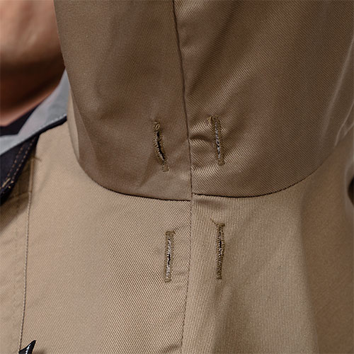 Jacket with concealed button fastener, with patch pockets, lower cargo patch pockets. Sleeves with outside sleeve seam, elbow pads, buttoned barrel cuff sleeves to prevent fabric getting into machinery. Ventilation eyelets in armpit area. Width adjustable hem.
