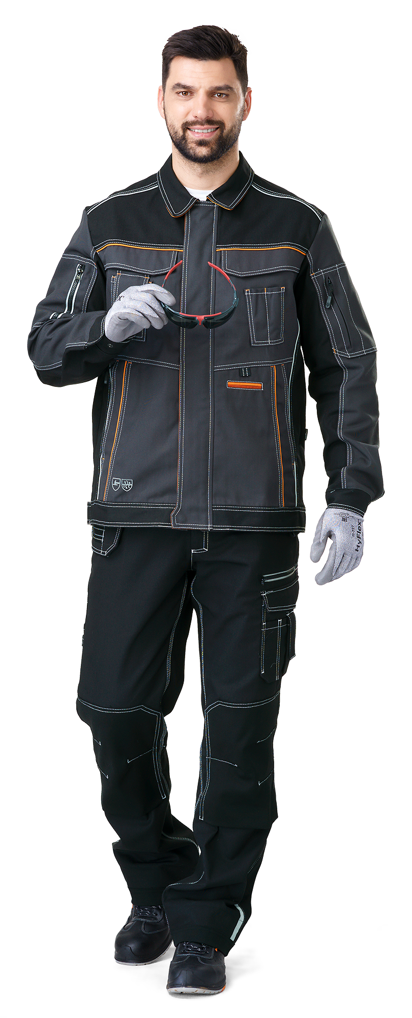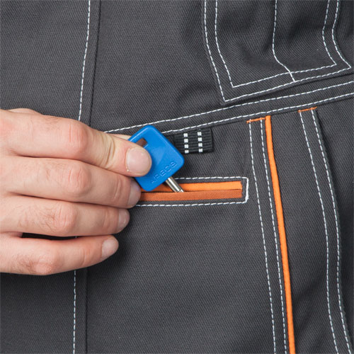 Zipper and storm flap with three snap buttons. Numerous multipurpose pockets. Breast pockets with flaps secured on Velcro tape, inside left breast pocket there is a pocket for ID card; pockets for a phone and pens. Side pockets. Pocket on the left for sundries, which can be fixed to the belt with a lanyard cord loop. Zippered pockets on sleeves. Turn-down band collar. Cuffed sleeves with outside sleeve seam. Width adjustable hem. Double ventilation in the armpit areas for extra protection against insects, pleated back with ventilation mesh inside the folds. Side parts of the jacket are made of durable and breathable CORDURA fabric. Reflective piping on front yoke, in yoke and back side seams.