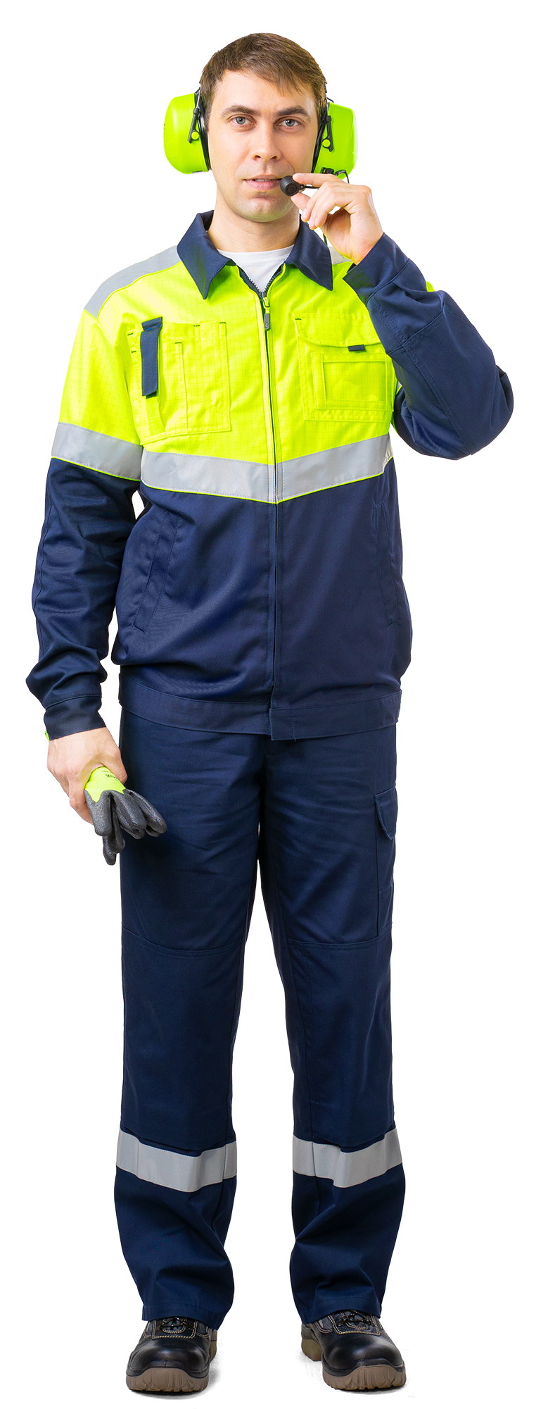 Concealed zipper prevents contact of accessories with equipment. Barrel sleeve cuffs allow working with moving mechanisms as fabric does not get into equipment. Multiple pockets: for documents, ID card, phone, pencil, tools. Elbow areas reinforced with patches for extra durability and to prevent chafing. Double mesh ventilation in the armholes. The band inside the jacket for name application. Dark blue fabric for areas which often get dirty.