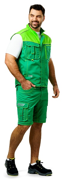 Jacket with band collar, front zipper. Zipper is covered with the concealed snap button placket. Jacket features complex patch breast pockets, slash zippered pockets, and side seam pockets. Detachable zippered sleeves with elbow seam feature darted patches for extra volume. Cuffed sleeves allow working with moving mechanisms as fabric does not get into equipment. Jacket can be converted into a vest allowing work in hot weather. Hem with side straps and snap buttons for size adjustment. Retroreflective ink printing and piping for enhanced visibility.