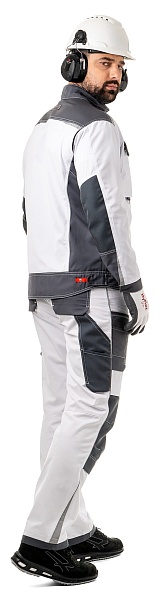 Jacket with band collar, front zipper. Zipper is covered with the concealed snap button placket. Jacket features complex patch breast pockets, slash zippered pockets, and side seam pockets. Set-in sleeve featuring an elbow seam and reinforced with large patches made of CORDURA durable fabric. Cuffed sleeves allow working with moving mechanisms as fabric does not get into equipment. Double mesh ventilation in armholes. The back armhole is pleated featuring knit fabric inserts under the pleats for the freedom of movement. Hem with side straps and snap buttons for size adjustment.