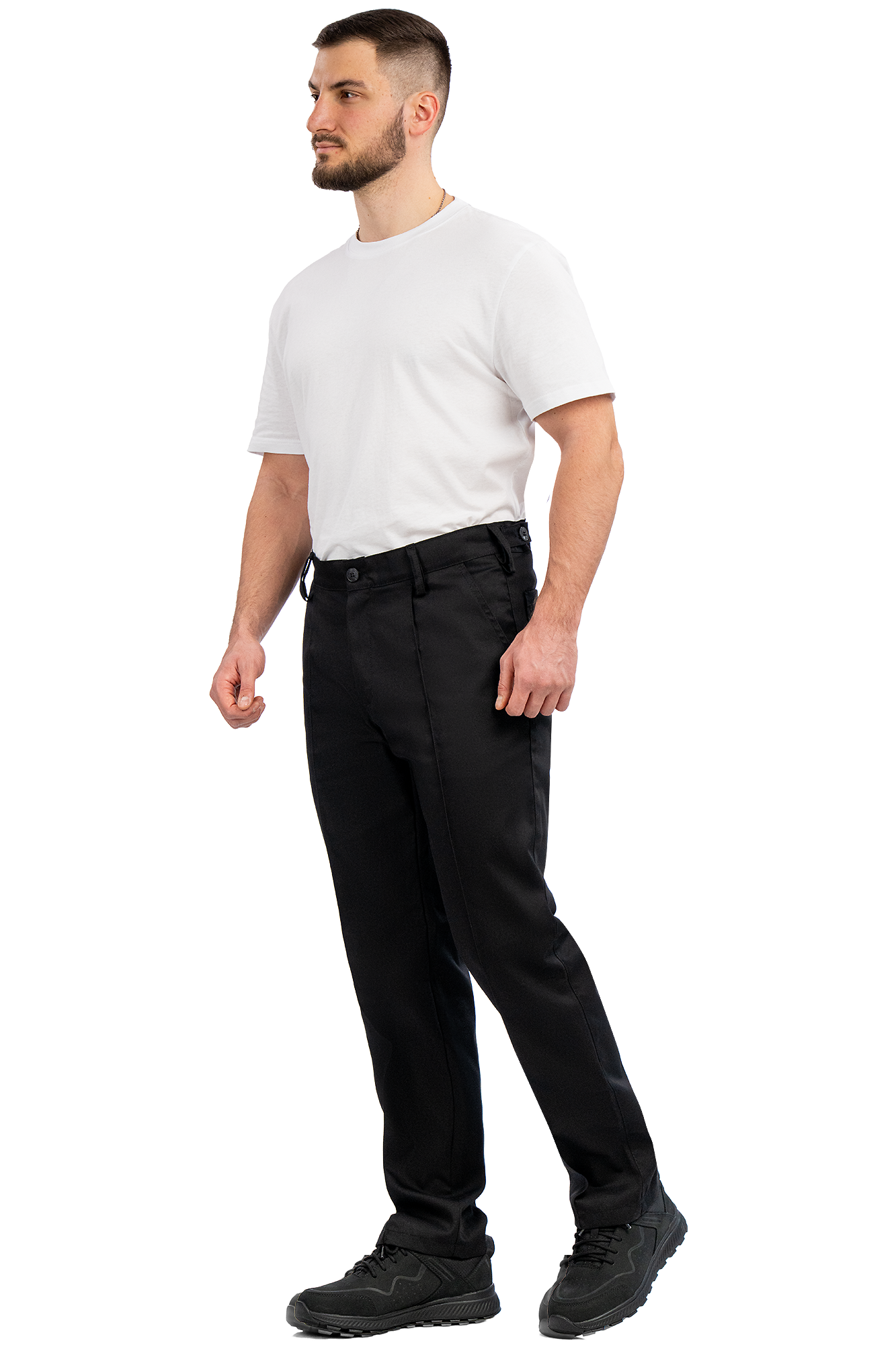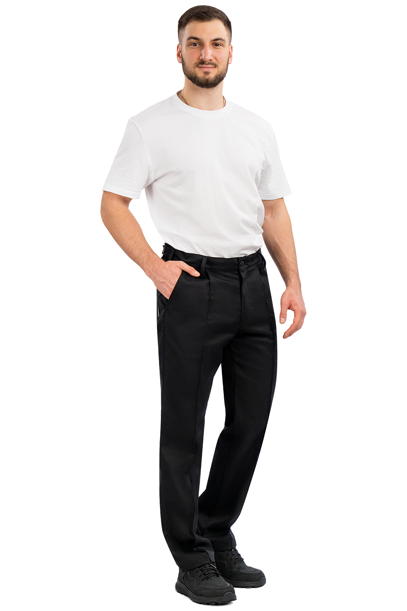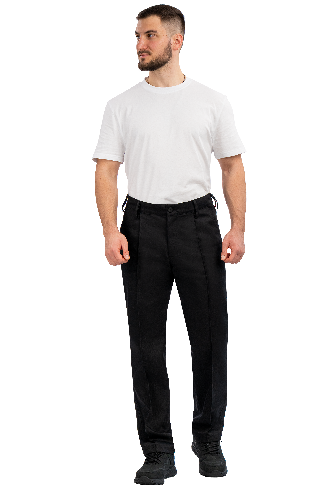 - Straight-cut trousers with stitched creases.