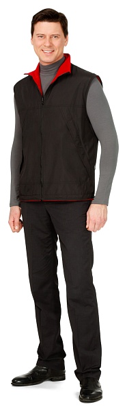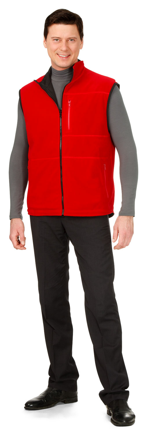 Reversible waistcoat: red side – knitted fleece fabric, black side – polyester jacket fabric.