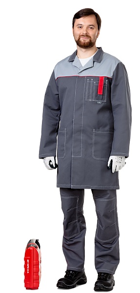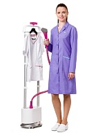 Semi-fitted lab coat featuring side front and side back seams, buttoned placket front, notched collar with lapels, breast and side pockets. Kick pleat in back, sewn down half belt. Long sleeves.